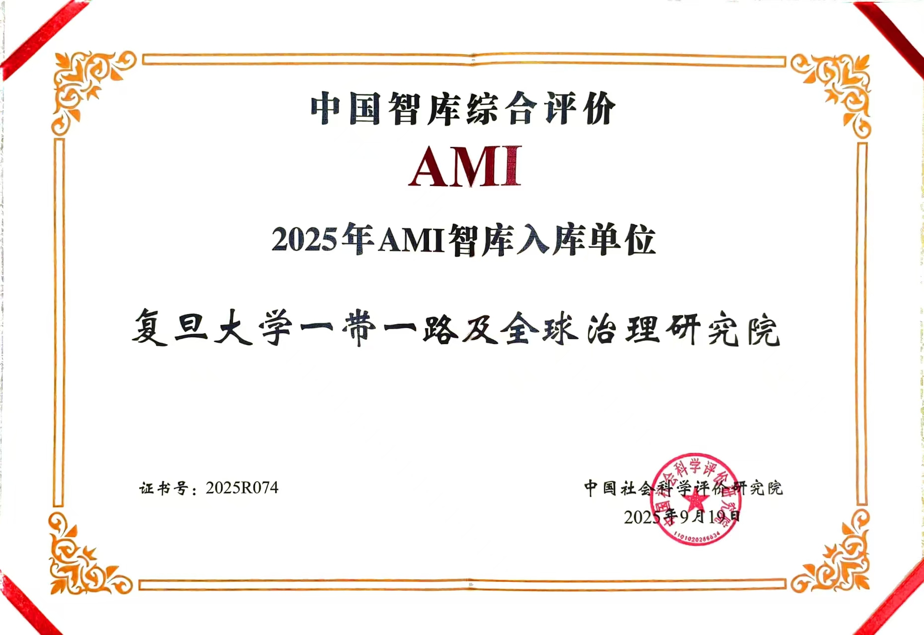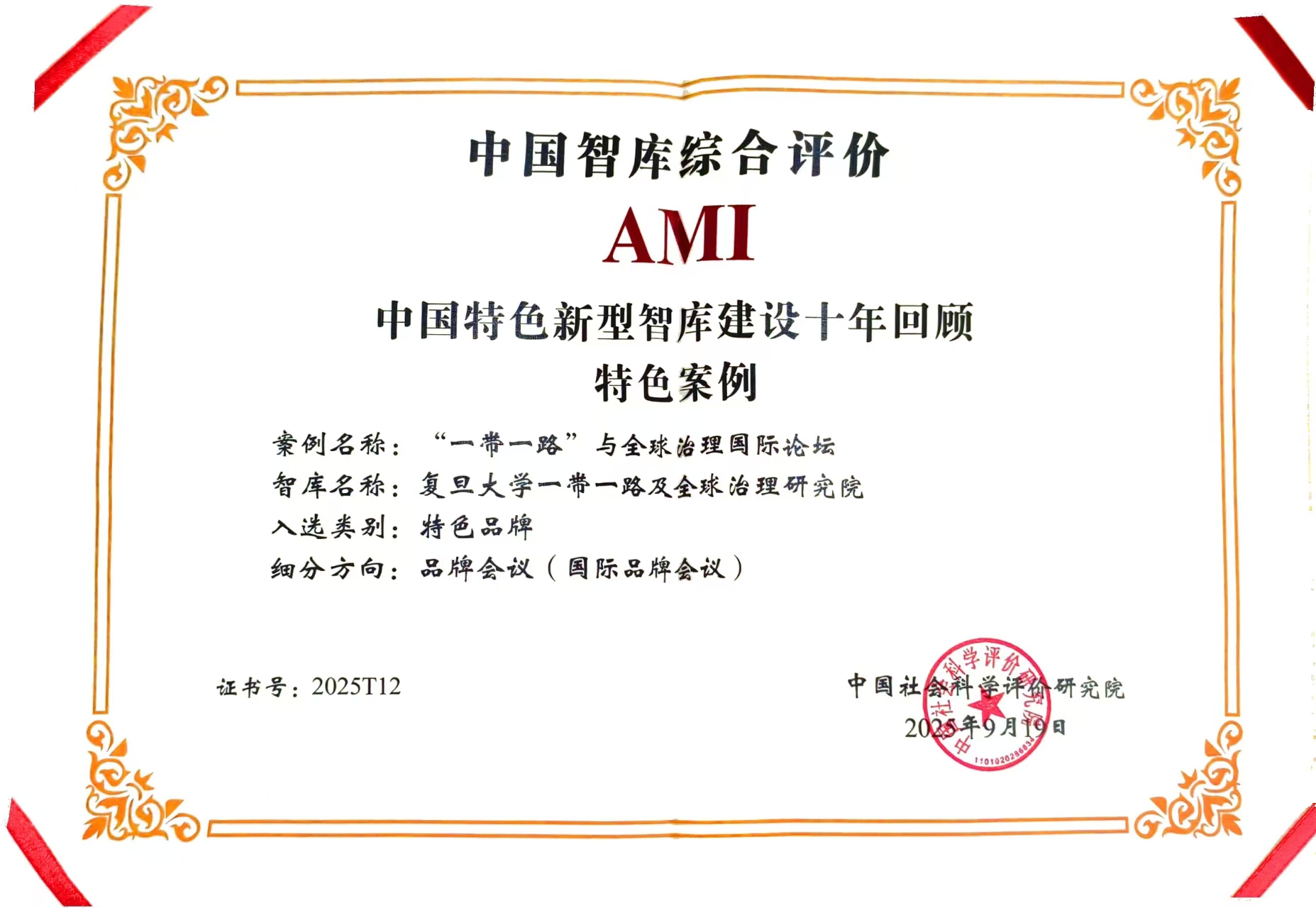 2025年9月19日,由中国社会科学评价研究院主办、中国社会科学评价研究院机构与智库评价研究室承办的第八届中国智库建设与评价高峰论坛在北京举行,会上公布中国智库综合评价研究项目(2025)评审结果。复旦大学一带一路及全球治理研究院(BRGG)入选“中国智库综合评价2025年AMI智库”名单,品牌会议“‘一带一路’与全球治理国际论坛”荣获“中国特色新型智库建设十年回顾特色案例”。
