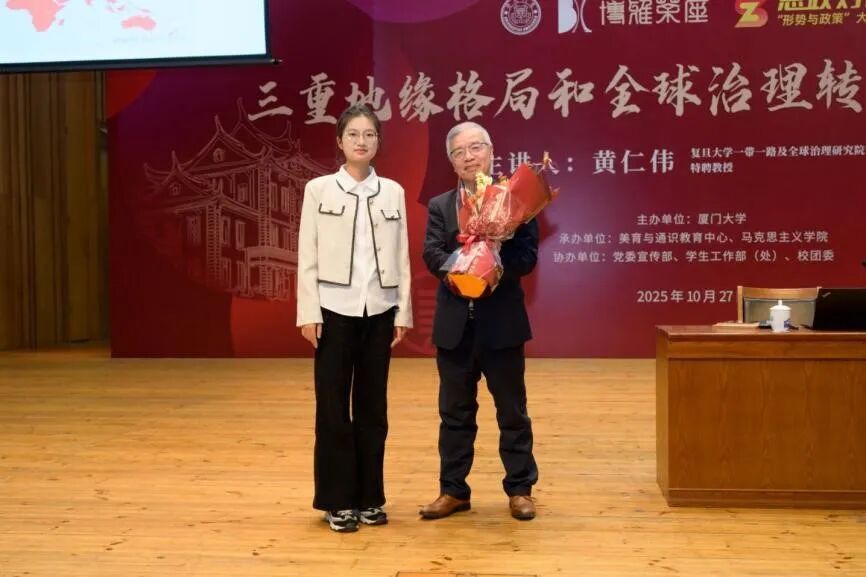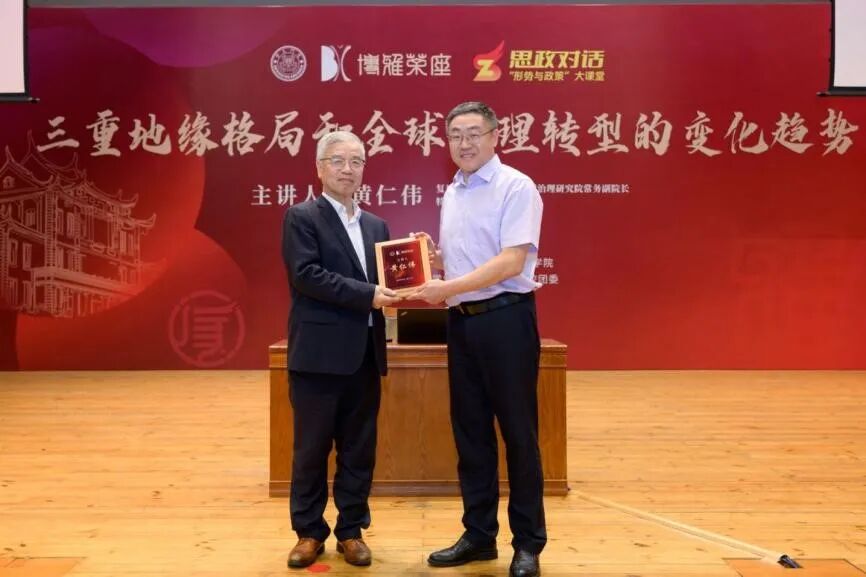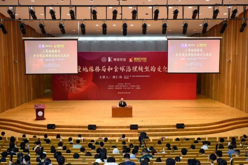 当前,国际局势错综复杂,全球地缘热点频发。为进一步了解当前世界三重地缘格局正在发生的巨大变化以及中国在百年未有之大变局下的所面临的历史机遇与挑战,10月27日,“博雅茶座”暨“思政对话”形势与政策大课堂在厦门大学思明校区科学艺术中心音乐厅举行,复旦大学一带一路及全球治理研究院常务副院长黄仁伟教授应邀作“三重地缘格局和全球治理转型的变化趋势”专题讲座。美育与通识教育中心、校团委、马克思主义学院等单位相关负责人、“形势与政策”大课堂的任课老师及线上线下万名学子共同参与交流。本次讲座由马克思主义学院副院长原宗丽教授主持。